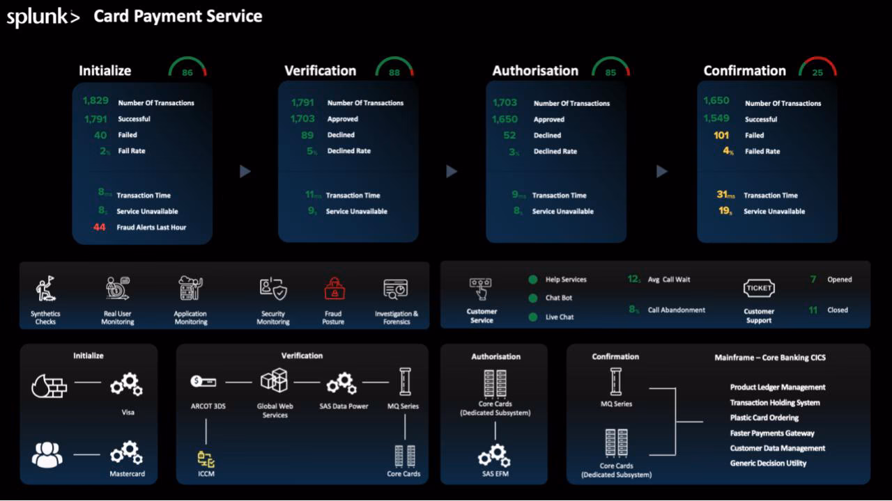 If a resilience framework needs to be rolled out to multiple critical business services (which it typically does) then having a template that can be applied consistently is one of the key criteria for success. With consistency of approach in mind including a technology solution that can be applied to deliver the key resilience outcomes can be used - as is shown in Fig 2 below. This shows how transaction failures, latency and fraud can be monitored using a single holistic view of a business service, in this case card payments.