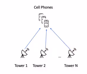 Rather than mention anything morbid, let’s make it a little less dramatic and just see how we can track something like a criminal robbing three stores in three neighboring towns one after another in a short period of time, such as 30 minutes or 1 hour. Most likely, they would have a cell phone in their pocket or car and it could send signals of its whereabouts to its corresponding cell tower. If we were to look for the cell towers involved in the robberies and find common cell numbers that involved all three cell towers, that cell number is a suspect for performing the criminal act. It does not mean the owner of the phone is the culprit as someone could be driving from location to location in that time period for other reasons. However, the list of suspects can be narrowed down quickly and other means can be used to identify with more positivity whether someone is the criminal such as a prior history of such acts. Let’s first look at this with a picture.