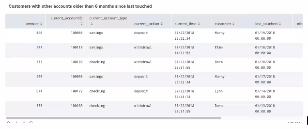 This may look a little involved, so let’s break it down. The first and second lines gather all transactions for account opening and we convert the last touched field, which is a human readable timestamp into epoch time, which is the number of seconds since January 1, 1970. It’s easier to do timestamp math with integers than it is with human readable text. Next, we join that data with current customer banking transactions. The where clause does the work for our outlier as it finds all events that have a current epoch time that is greater than the account opening epoch time. If it is greater than 6 months, This meets our criteria for “first time seen” for a customer who did not touch their account after opening for at least 6 months. The rest of the SPL is just formatting to make the output table prettier to turn the epoch time back into a human readable timestamp and convert the amount involved into a simple integer, but for our discussion, we will ignore it here. A sample output is shown below for this SPL.