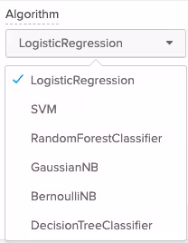 5. Train your model by using the guided workflow for experiments in the Splunk MLTK. For this general purpose binary category prediction, I’ll show an example from the MLTK showcase under the predicting fields section, specifically the predicting telecom customer churn example.