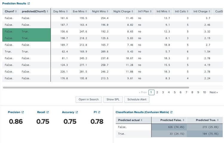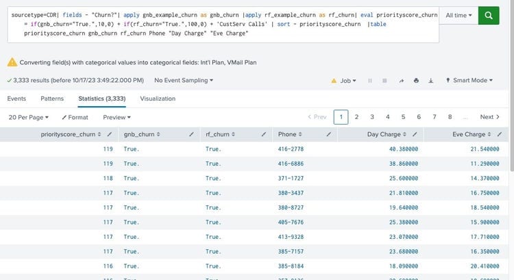 What we are doing here is applying multiple models to the real world data to predict the categorical field in the data. The reason we are applying multiple models is to give weights of importance to each model based on the model’s accuracy scores. In this example, model1 has 10 times more importance than model2 so its weight is assigned a 100 while model2 is assigned to 10. Just to add to the score, one of the fields from the data is added as it may have a small influence on the accuracy of the predicted field. In our Splunk MLTK Showcase example, I added the number of customer service calls to the score as that may also explain why the customer is leaving or causing churn. Here’s the search using the Splunk MLTK Showcase data.
