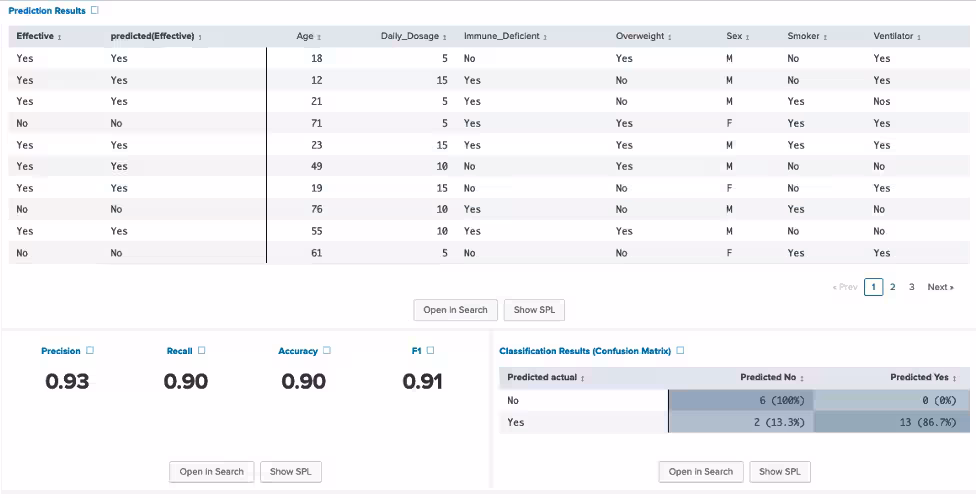 Now, what if we combined both models and put a weight for the results of each model to come up with a cumulative score? We’ll give Random Forest way more importance in our search by assigning it a value of 100 and give Logistical Regression results a value of 10 every time each predicts that the drug is effective (Effective=Yes). We’ll also subtract 10% times the patients age from the total score as we know beforehand, for some reason, that this drug may not be as effective for older patients. The total score when both models report Yes would be 100 + 10 – 0.1*Age. We’ll then use a threshold to ensure some kind of confidence so that if our prediction is greater than the threshold, we are confident that it is probably going to be correct. In this case, we are saying the score (100 + 10 - 0.1 * Age) is greater than 105, our threshold. Let’s see the Splunk search.