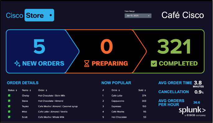 Real-time insights from Webex Connect mobile coffee orders with sales trends and operational metrics