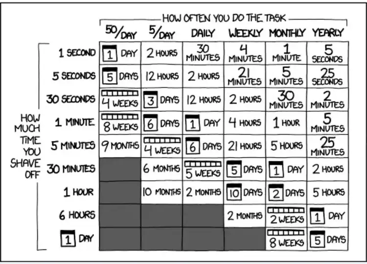 As you review the results of the intersection of those axes, an interesting pattern emerges. The sweet spot for automation saving time is tasks that take at least five minutes and recur daily. More frequent events and complicated tasks are more likely to be worth the trouble of automating, seeing that automating a task that takes one hour to accomplish and is done five times a day could save 10 months of effort annually.