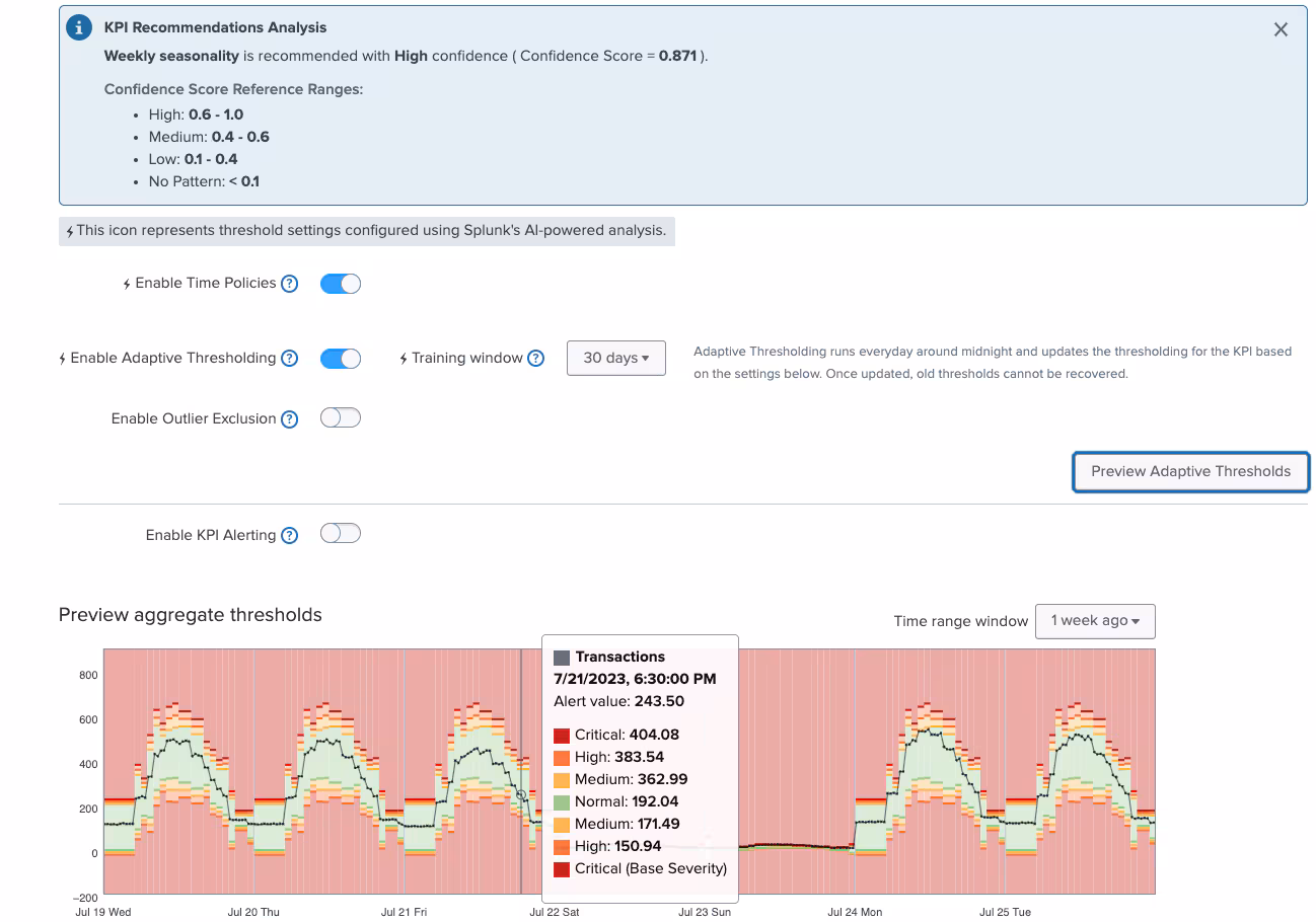 Adaptive thresholding is a key capability in Splunk IT Service Intelligence (ITSI) that enables customers to dynamically monitor the status of their key performance indicators (KPIs) and derive meaningful service insights and alerts. The latest release of ITSI, Version 4.17, includes a preview of ML-Assisted Thresholding, a machine learning-powered feature that recommends the optimal adaptive threshold configurations for KPIs so customers can effectively configure thresholds in seconds and offload all manual data analysis with the help of Splunk’s built-in machine learning (ML). With ML-Assisted Thresholding, ITSI users can get up and running faster when configuring services and KPIs, and free up time for work (or fun) beyond the iterative exercise of thresholding.