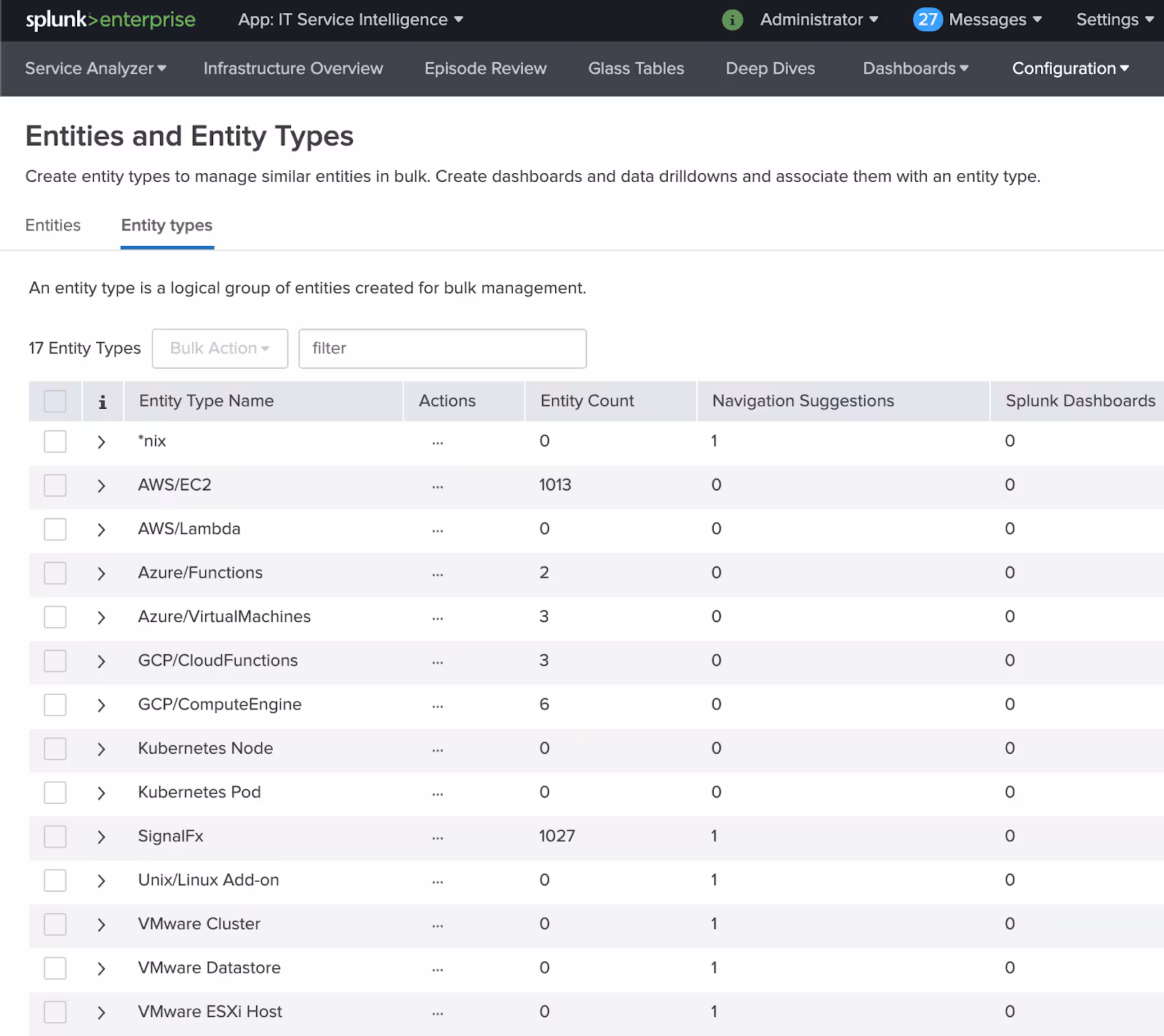 New in ITSI is the ability to assign a specific type to an entity which allows for both Navigation Suggestions and a Key Metrics view. This Content Pack includes a definition of the new SignalFx Entity Type, that will build a link directly to the resource in the Splunk Infrastructure Monitoring dashboard (formerly known as SignalFx). Also in this Content Pack are Key Metrics defined for each of these new types, giving you a new infrastructure view of a given metric; rather than a single entity’s metrics you see all of them aggregated.