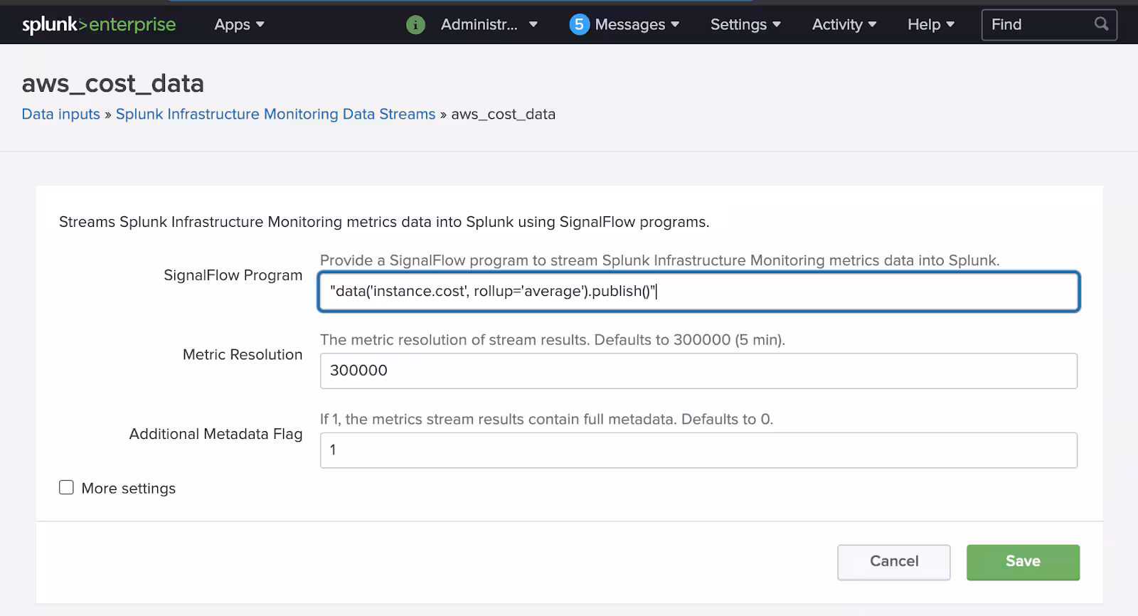 Configuring this modular input is simple. Navigate to the input within Splunk Web by going to Settings > Data Inputs > Splunk Infrastructure Monitoring Data Streams. Then click New and provide the SignalFlow program you want to use. The following image shows an example SignalFlow expression: