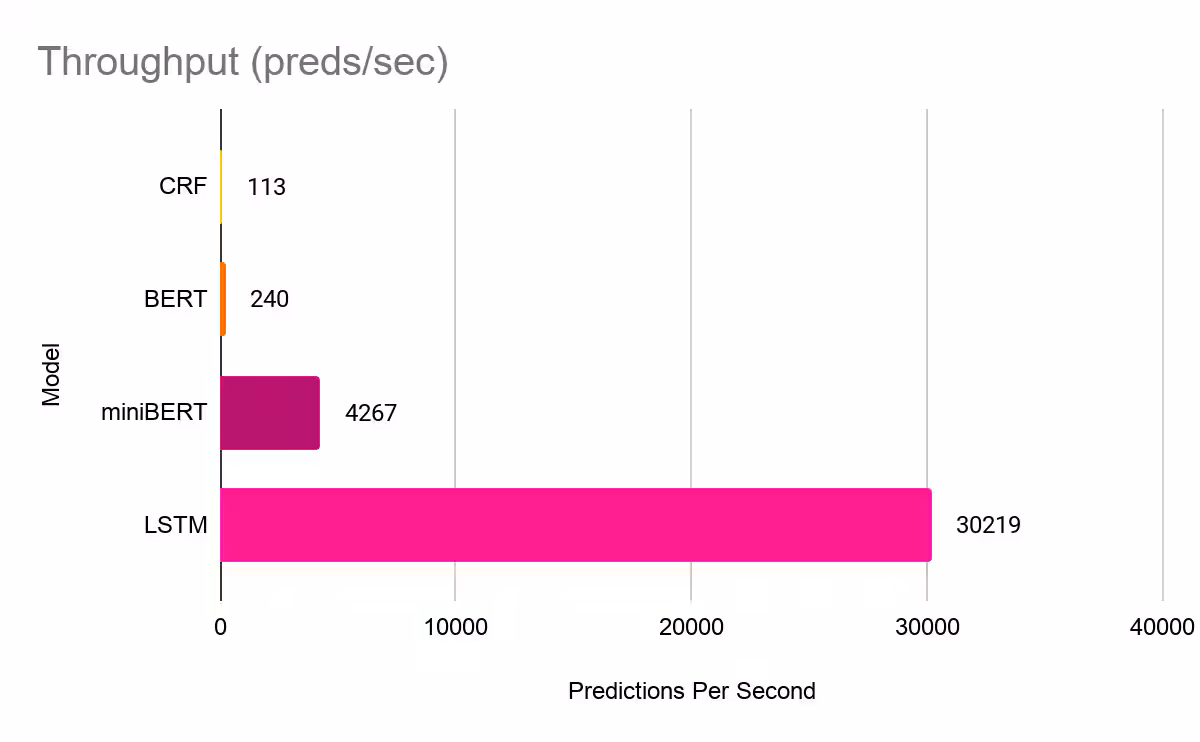 Next, we check the throughput of each model to assess model scalability and cost. Below is the throughput of each model with a batch size of 64 (with the exception of CRF as it cannot do batch inference due to its Viterbi decoding -- which is a dynamic programming algorithm):