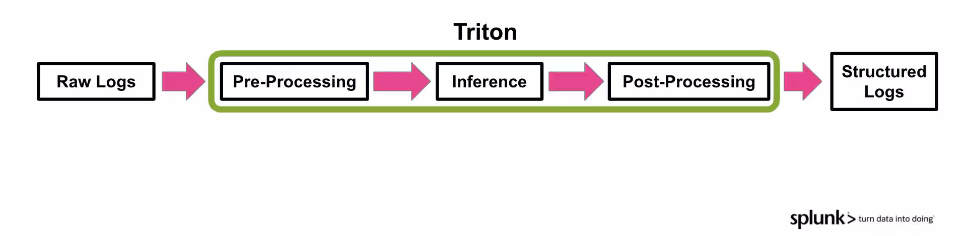 In order for us to send Triton a raw log and get back a structured log, Triton must perform pre-processing, inference, and post-processing. This is done using Triton’s “ensemble” models, which can run arbitrary Python code using Triton’s Python backend. This not only simplifies our architecture by putting all log-processing in one location, but also allows our applied researchers to easily deploy development code without translating it to Scala. This latter point gives the two-fold benefit of both speeding up researchers’ development cycle, as well reducing the opportunities for bugs to be introduced.