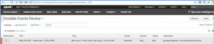 b. Open the Notable Events Review in ITSI and click the “node down” event group.