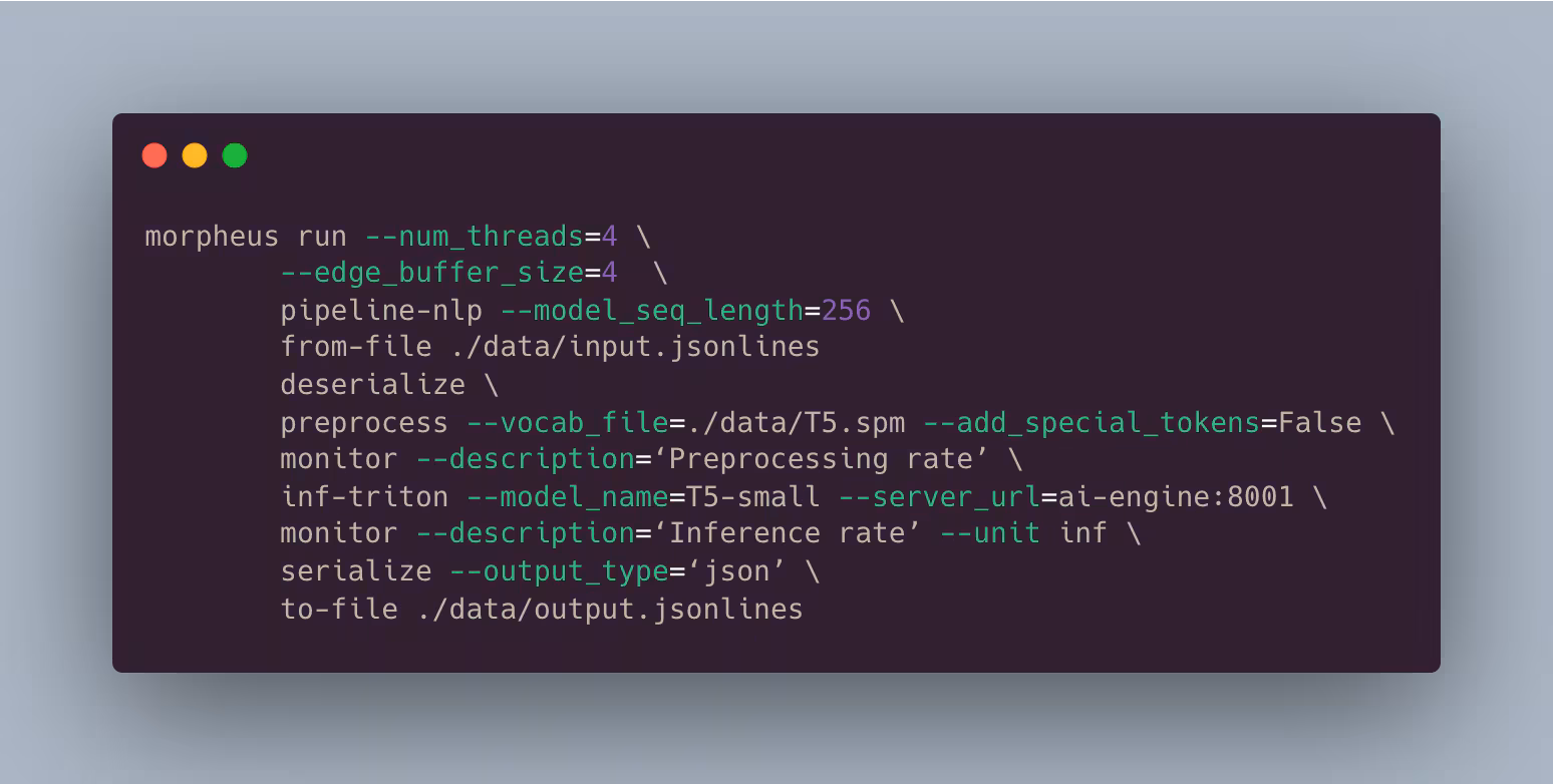 Once the stages are ready, the Morpheus pipeline can be built via CLI. Under the hood, Morpheus will efficiently take care of the orchestration, management of all resources (CPU/GPU/Network), communication between distributed pipelines, and monitoring of the throughput and model drift over time. It automatically adjusts buffer sizing between stages to optimize hardware saturation, maximize throughput, and minimize latency. The backend engine is in C++ for optimized performance, but there is an easy-to-use Python interface.