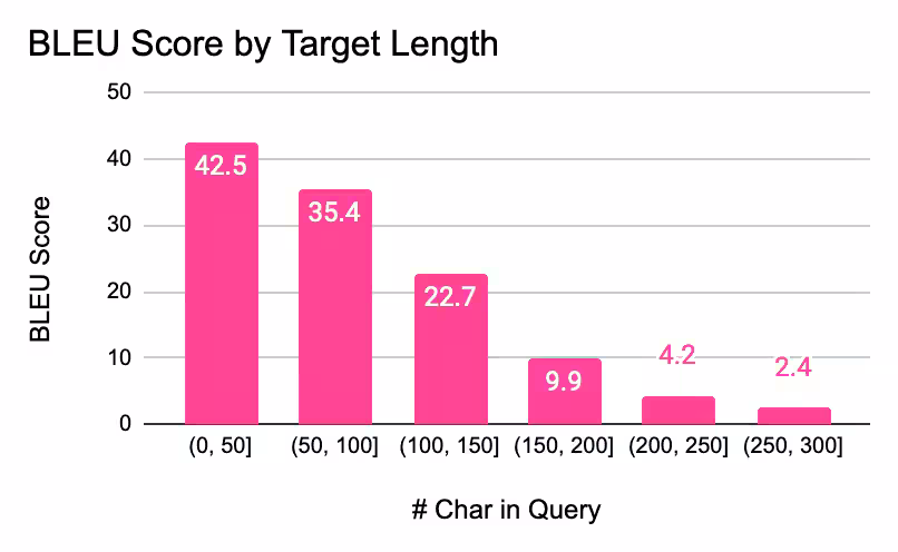 Further analyzing the model’s performance, we confirmed our intuition that the model is performing better when it needs to predict short queries and when it is given short English descriptions. The small bump on the right-hand graph at the end of the distribution is probably due to high variability in the metric calculation (approximately 0.9% only of the pairs are in this bucket, and 86.8% of the pairs are in the first 3 buckets).