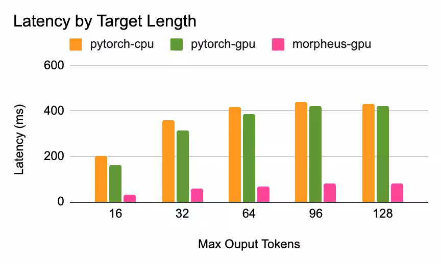 Latency is a critical requirement for real-time applications; if not taken into account, it has a significant negative impact on the user experience. Our goal was a full pipeline latency of 100 milliseconds or less, which feels instantaneous to human perception. We ran experiments using t5-small to compare inference latency on different runtimes using 1,200 English/SPL translation pairs of varying lengths. We used a single V100 32GB GPU with a Dual 20-core Intel Xeon CPU, and ran experiments using a batch of size 1. In our dataset, the average number of input tokens was 32 and output tokens was 21. For our target length experiments we compared the latency using 32 input tokens, and for our source length experiments we compared the latency using 32 output tokens. The pipeline was on average 5x times faster using TensorRT in Morpheus than Pytorch CPU. With longer English sentence inputs, like 260 and 505 tokens, we see a 10x speed up compared to Pytorch CPU.