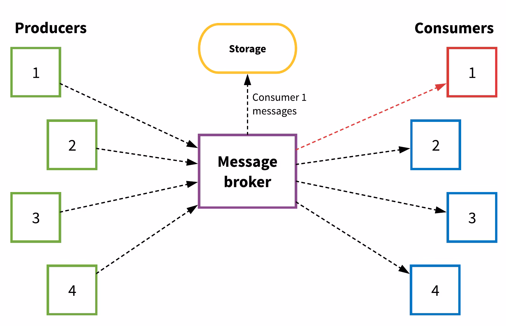 In this figure, producers 1, 2, 3, and 4 are busy pumping messages into the pipeline through the message broker, while consumers 1, 2, 3, and 4 process (and then acknowledge) those messages. In this example, a serious problem emerges when consumer 1 fails. Producers are continuing to pump data into the system but consumer 1 can't handle its tasks. What should happen is that the broker begins storing all message data intended for consumer 1 until it's again ready to process incoming messages.
