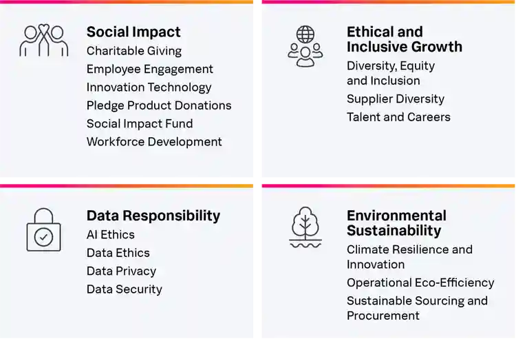 - We outline the four pillars of our Global Impact Strategy - Social Impact, Ethical & Inclusive Growth, Data Responsibility, and a new pillar, Environmental Sustainability, which includes climate change