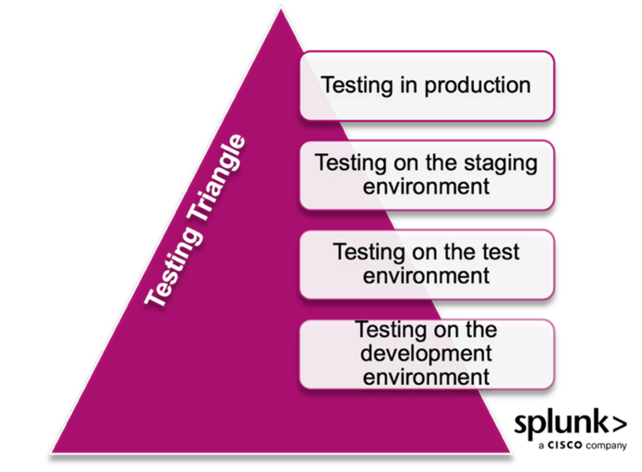 Testing is all about checking whether the developed application meets the defined requirements in terms of functionality, quality and reliability. In agile organizations, testing runs parallel will the development and deployment phases, and is carried out within different environments (see the testing triangle below) to try find and fix defects before the end user gets access to the application.