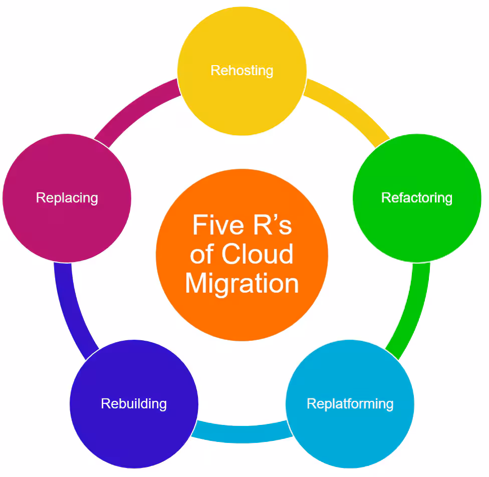Often referred to as the “Five Rs,” there are five common ways that organizations migrate data and applications to the cloud, listed here in order of complexity from simplest to most complicated.