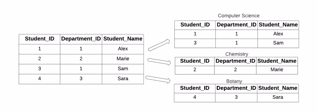 For example, imagine a table containing student information for all departments in the science faculty of a university. As the diagram illustrates, this table can be split according to each department, such as computer science, chemistry, maths and biology.