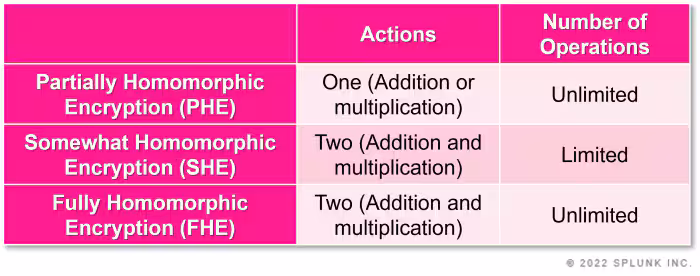 - Somewhat Homomorphic Encryption (SHE). ‘Somewhat’ is more general than PHE in that it supports homomorphic operations with additions and multiplications. However, only a limited number of operations can be performed on the encrypted data.