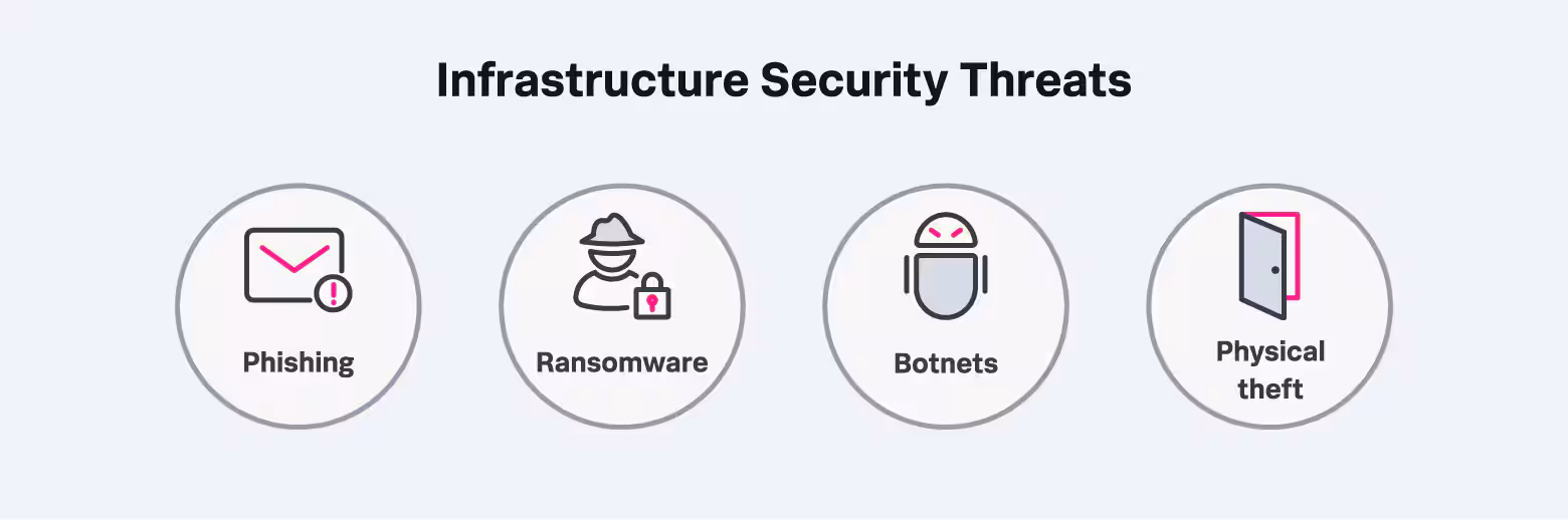 In addition to focusing on direct threats like malware, phishing, and ransomware, infrastructure security also addresses broader risks such as equipment failure, human error, and physical breaches. It involves creating a comprehensive security framework that combines technology, policies, and processes to safeguard assets, ensure compliance with data protection regulations, and maintain operational continuity.