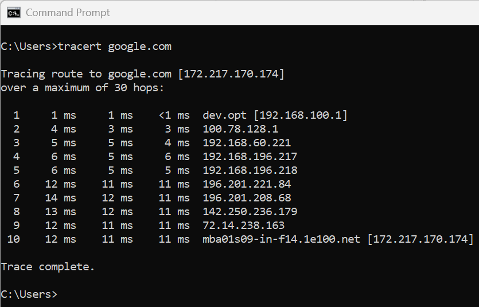 Trace route command example