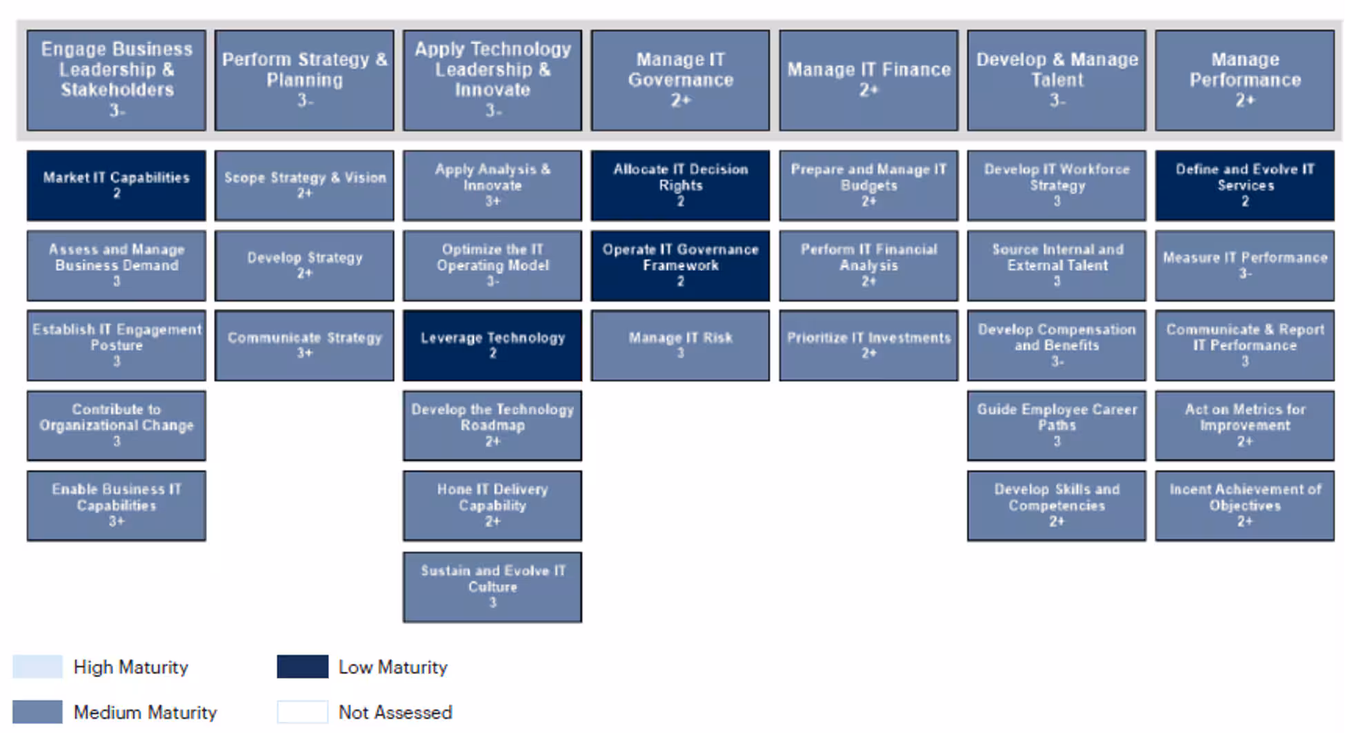 These assessments measure, analyze, and understand the status, behavior and performance across IT dimensions. They highlight well-performing areas and identify gaps or concerns that require improvement. By comparing with expectations, IT functions gain better insight into their current position and determine what needs enhancing to get to the next level.