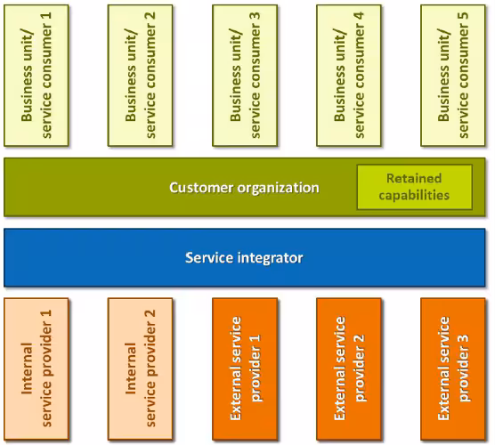 The service integration layer sits in between the customer organization and the service provider(s), and operates through practices, processes, functions, roles, and structural elements.