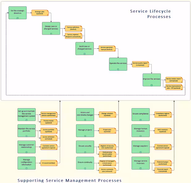 The YaSM model provides detailed templates to ease implementation, from both time and effort perspectives. The YaSM process map consists of service lifecycle processes and supporting service management processes.