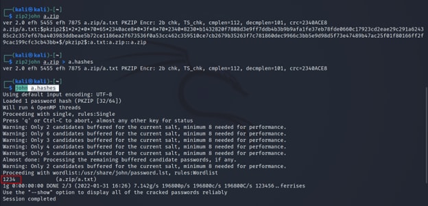 echo ‘hello’ > a.txt zip -e a.zip a.txt zip2john a.zip > a.hashes john a.hashes