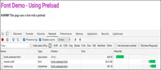 This instructs the browser to proactively download roboto.woff, and creates this waterfall: