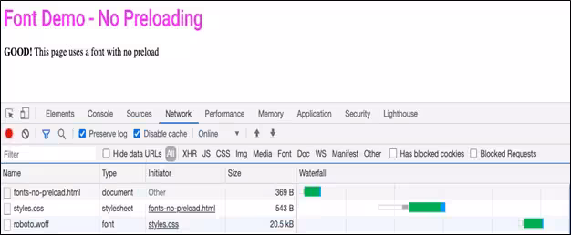 This is a perfect example of a late-discovered resource. This browser doesn’t know it needs to request roboto.woff until it finishes downloading and parsing style.css. We can confirm this by looking at the Initiator column in the waterfall, which tells us what file caused the browser to make the request. The HTML document has an initiator of Other because we typed it into the address bar. The initiator for style.css was the HTML document since the browser found the <link> tag in the HTML. The initiator roboto.woff was the CSS file since the browser found the @font-face declaration for a style in the CSS file that was used in the HTML.