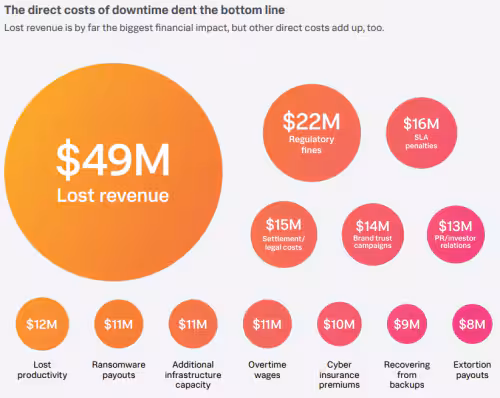 Illustration showing the various direct costs of downtime, measured in USD millions, The Hidden Cost of Downtime, 2024