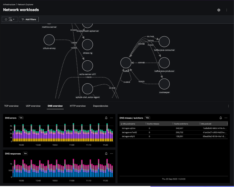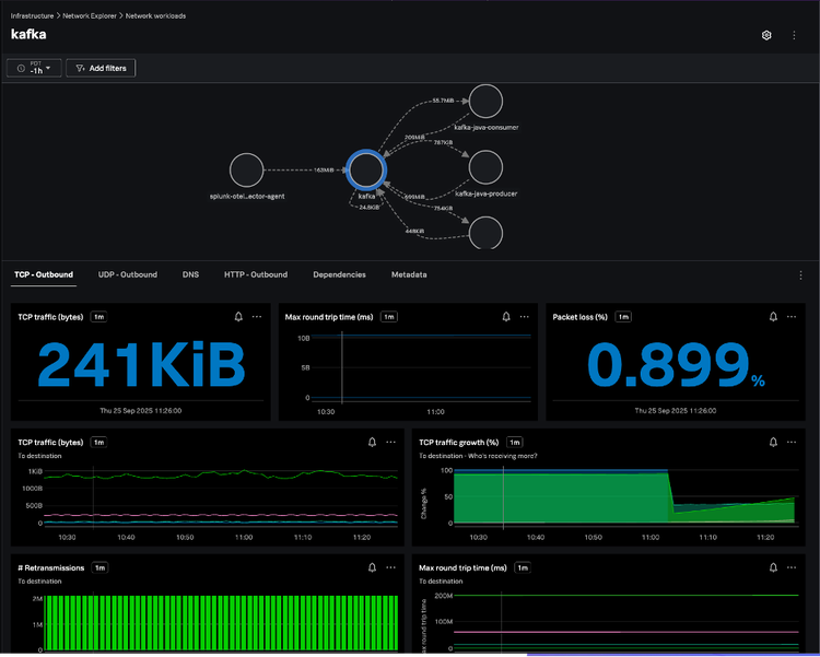 Within Splunk Observability, these insights come to life through the Network Explorer, where every workload becomes an interactive node in a real-time topology. In the example above, we’re investigating a Kafka workload’s TCP health over the past hour. The map highlights its communication with java-consumer and java-producer workloads, along with key metrics like packet loss, round-trip time, and retransmissions — all captured through eBPF at the kernel level and surfaced instantly in Splunk.