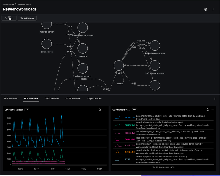 Because this is a workload-centric view, users can move fluidly across tabs for UDP, DNS, HTTP, or dependency data — each view enriched with Kubernetes and process metadata. The result is a complete, live picture of what each workload is doing on the network and how it’s performing, all within the familiar Splunk Observability experience.