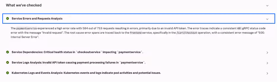Now, instead of embarking on this manual deep dive through countless dashboards, logs and traces to find the root cause, the AI Troubleshooting Agent provides you with: