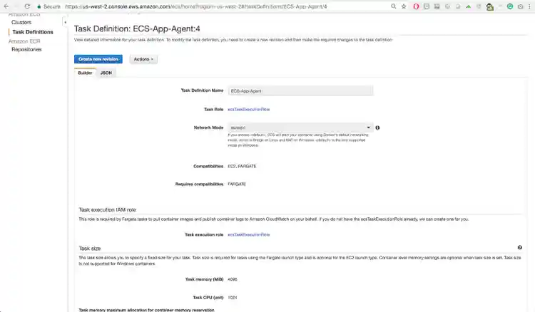 - Create a task that acts as a recipe for the deployment of your containers. Define all the info for each container, including environment variables, in the task. Note: one unfortunate feature of ECS is that you can’t pass environment variables across all containers, as you would with a environment file. Rather, you must name the environment variables for the agents in each container, if you aren’t naming them another way. Fortunately, you can do all this using the JSON task definition, so this is easily scriptable.