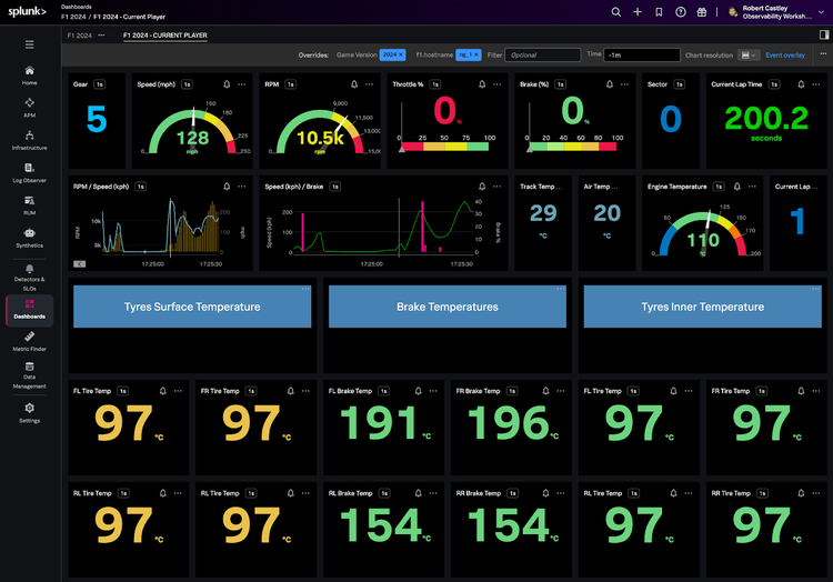 Splunk's powerful Enterprise platform and observability suite were at the heart of this experience, enabling us to capture and analyze vast amounts of racing data in real-time. The game's telemetry data was transmitted in UDP format, which we adeptly converted into JSON payloads for detailed analysis.