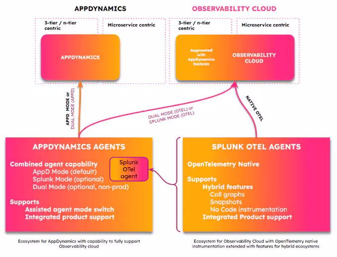 AppDynamics customers now have a single agent to collect telemetry data for use in either Splunk AppDynamics or Observability Cloud. This agent enables them to avoid costly and disruptive changes in their deployment and integration pipelines, while evaluating or transitioning monitoring to Observability Cloud.