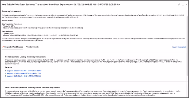 When anomalies or health rule violations occur in an n-tier or hybrid environment, the AI troubleshooting agent for AppDynamics goes beyond simply flagging an issue. It explains what’s happening, why it’s happening, and how to fix it. You get clear, concise root cause summaries right where you need them without bouncing between dashboards or guessing which metric matters most.