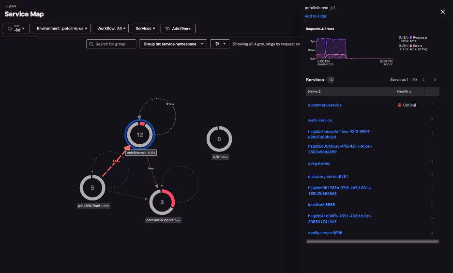 - Service map grouping – visually organize related services using indexed span tags and monitor the health of each group