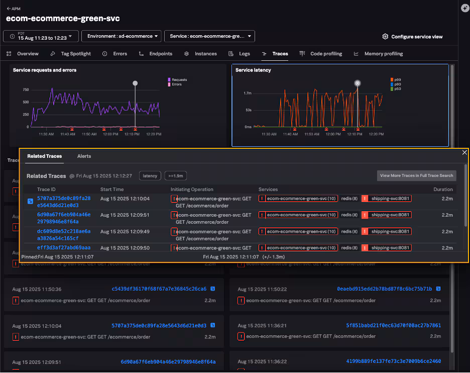 Example (continuing from above): You already know the ecommerce-green-svc service is the source of the problem. You drill into the service-centric view of ecommerce-green-svc to investigate further. After confirming the service is unhealthy and showing elevated latency, you analyze relevant traces. The Traces view automatically surfaces problematic traces for the service, so you click on the longest trace to understand what happened.