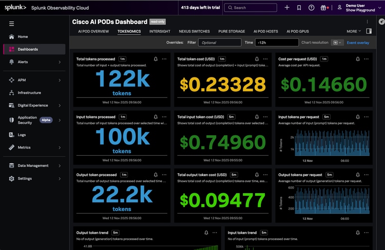 These dashboards provide GPU-related metrics such as GPU utilization and power consumption, as well as “tokenomics” metrics like time-to-first token and estimated token costs to assess the utilization and workload efficiency for hosted AI infrastructure like Cisco AI PODs.