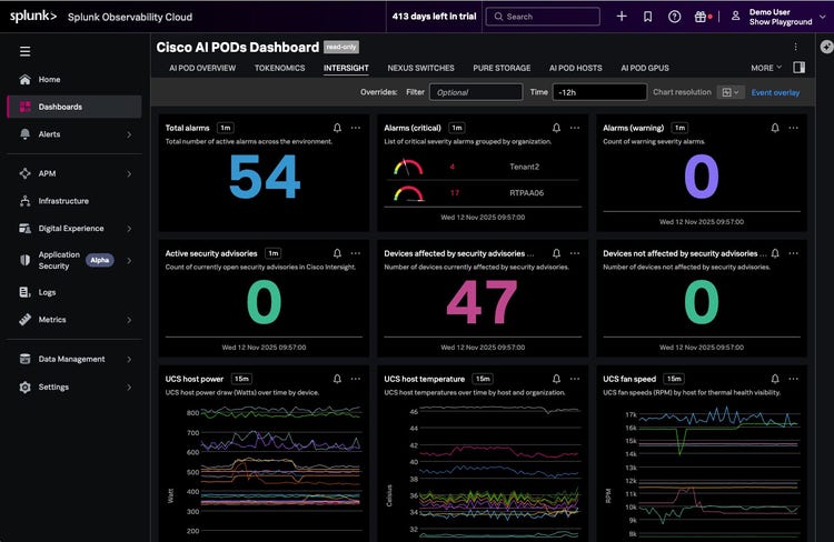 That’s why we launched AI Infrastructure Monitoring last year. As of November 2025, teams can now use AI Infrastructure Monitoring to view data-dense dashboards and detectors for Nvidia NIMs, Milvus and Pinecone vector databases, LiteLLM proxy services, GCP VertexAI applications, Cisco AI PODs, and more.