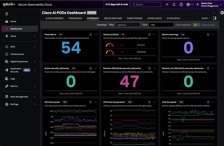 Because Cisco AI PODs are pre-validated, full-stack infrastructure hardware solutions that include Cisco UCS servers, Nexus 9000 Series switches, and integrated software components such as Cisco Intersight, AI Infrastructure Monitoring, also provides those dashboards with key metrics like UCS fan speed, host temperature, and host power.