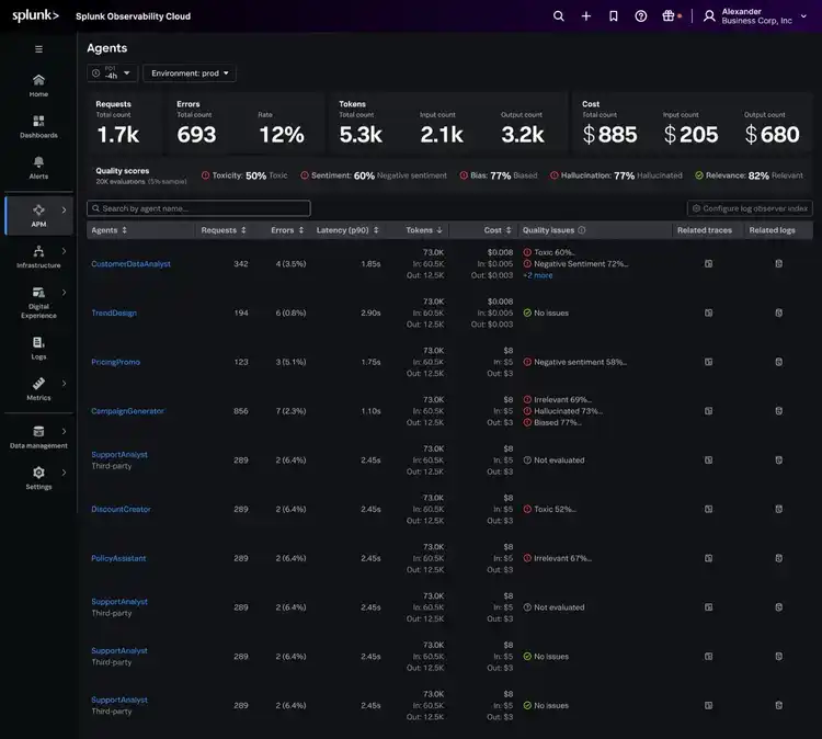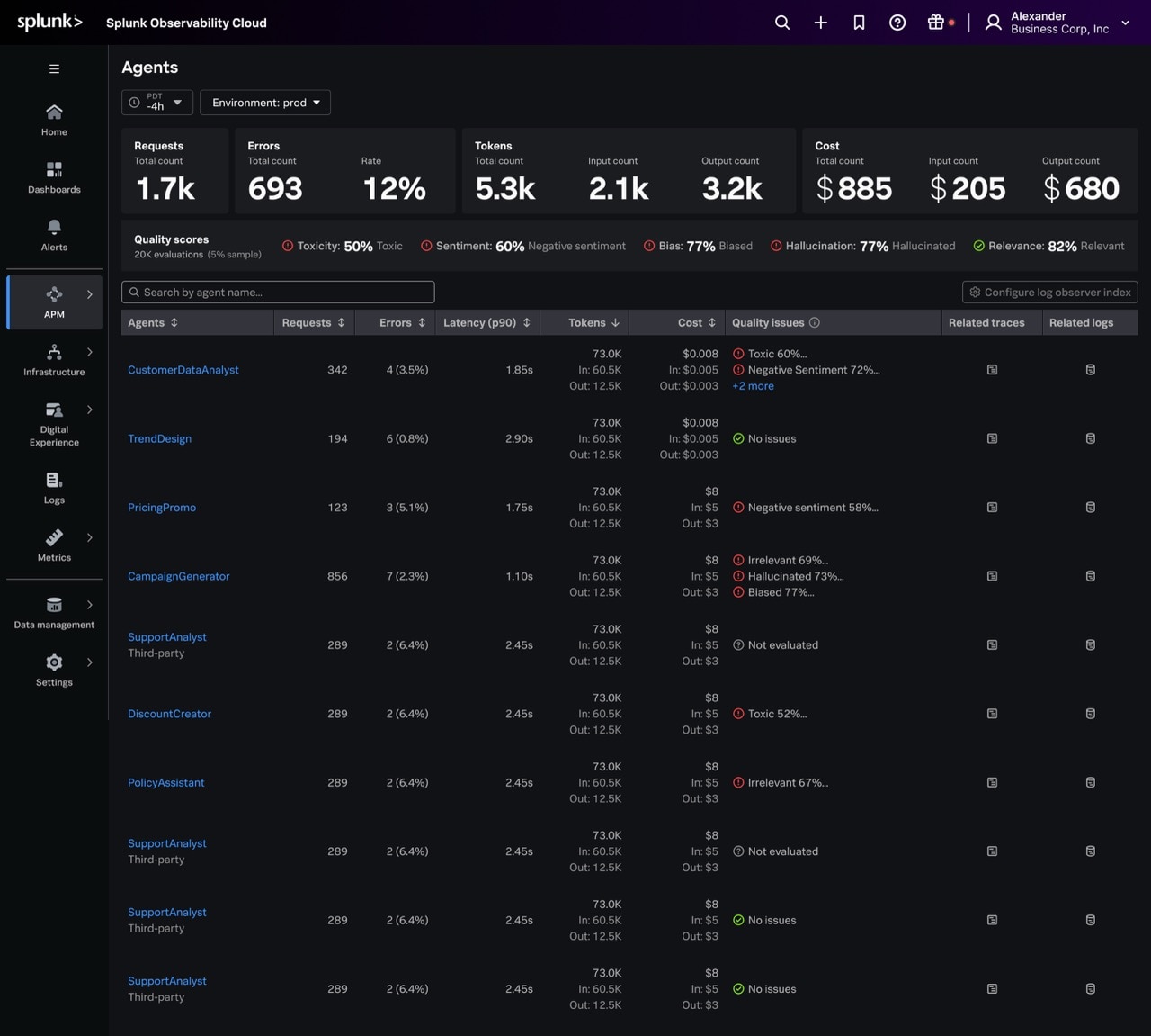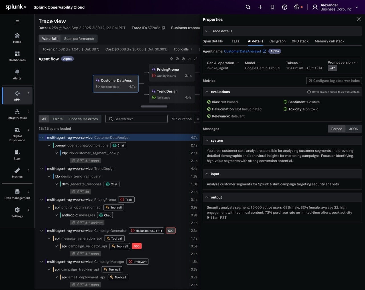 Aligning with our commitment to empower ITOPs and engineering teams with open standards, Splunk is now collaborating with AGNTCY, a Linux foundation project, to accelerate the development of semantic conventions and instrumentation in OpenTelemetry (OTel) for GenAI and multi-agent system (MAS) metrics, events, logs, and traces (MELT). By championing these shared standards, Splunk ensures its customers benefit from consistent, vendor-neutral telemetry capture for large language models (LLMs) and agentic applications, strengthening our AI Agent Monitoring capabilities.