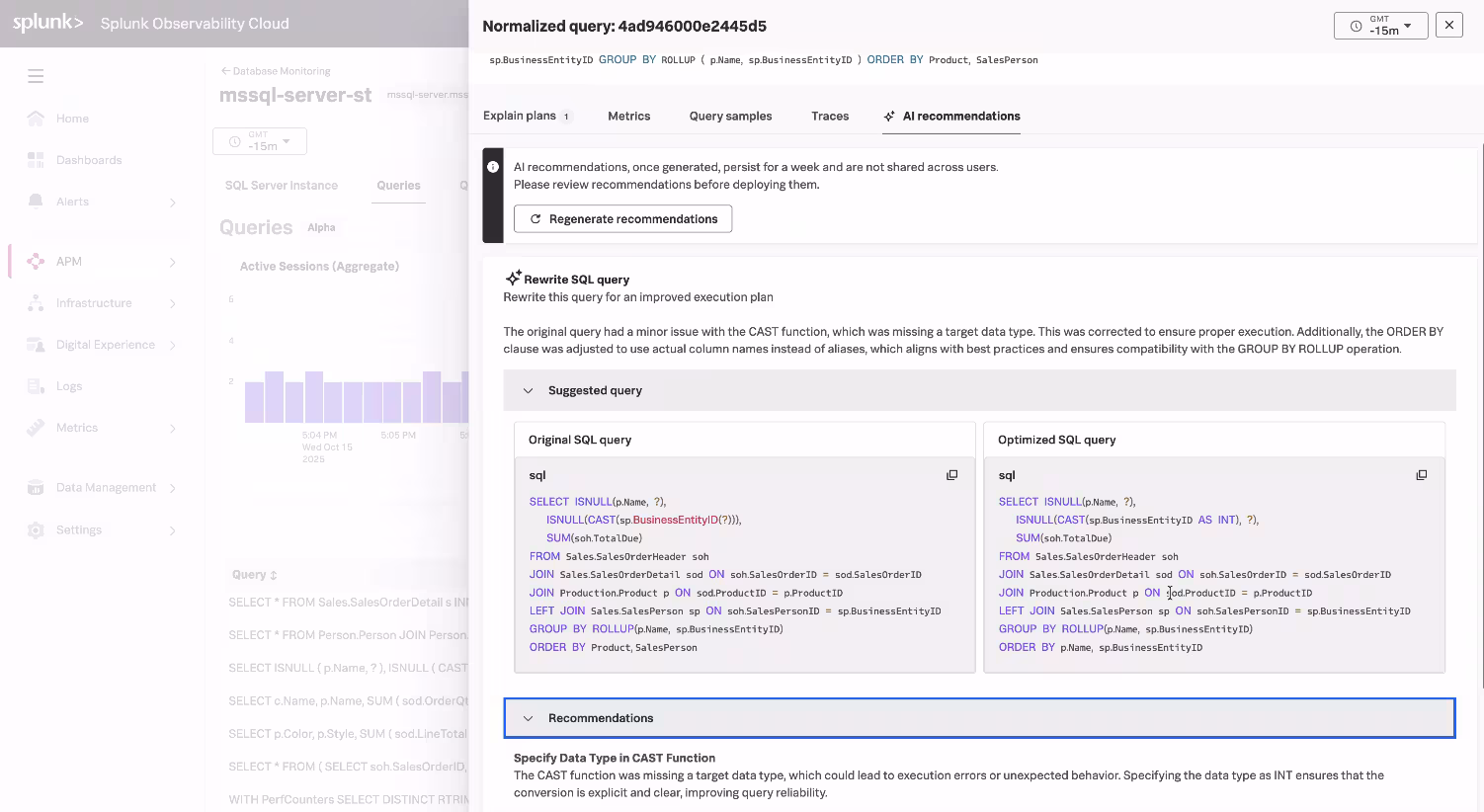 Splunk Database Monitoring accelerates this process with AI-powered summarization and recommendations. AI summarization explains long, complex queries in plain language, highlighting key inputs and potential inefficiencies. AI-powered recommendations suggest targeted optimizations such as index changes, query rewrites, or SQL hints, and even provide ready-to-run code to speed remediation.