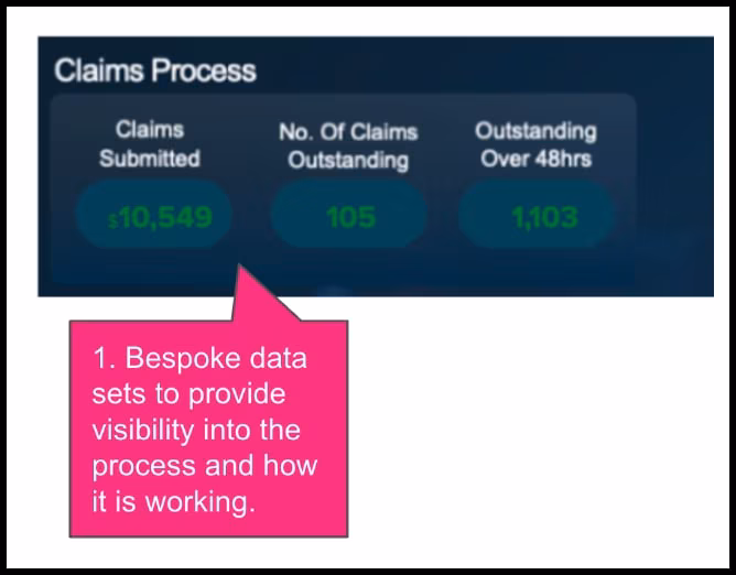 2. KPIs that demonstrate the quality of the claims process service. In this example, these are focused on the key business process, steps and outcomes of the service, so that the quality of it can be quickly determined. For example, we can understand: