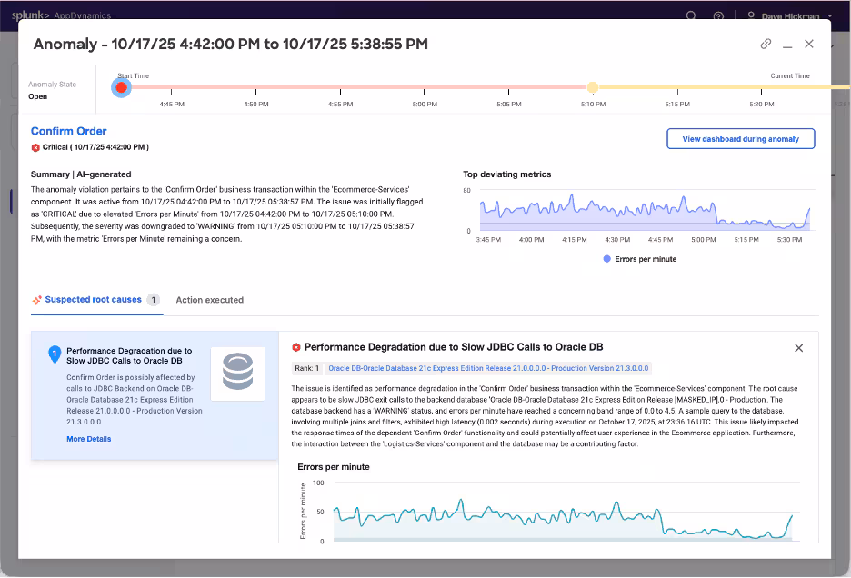 That’s where the new AI Troubleshooting Agent for Business Transaction & Database Anomalies comes in. It’s like having a seasoned engineer sitting next to you, explaining what probably happened, why and what you can do about it. Built on AppDynamics’ existing topology-based Root Cause Analysis, this AI-powered feature takes anomaly detection several steps further.