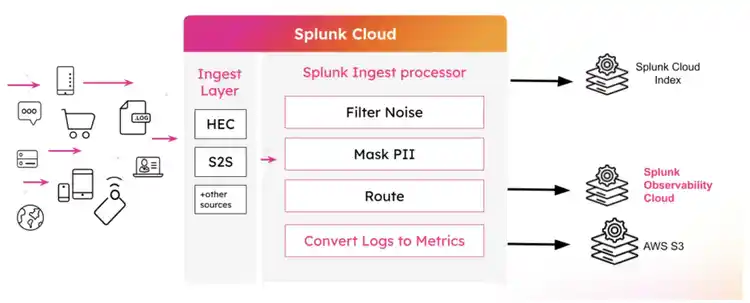 - Data Routing - once the data is processed, it can be routed to the Splunk data platform for ingestion, to an Amazon S3 bucket and/or to the Splunk Observability Platform.