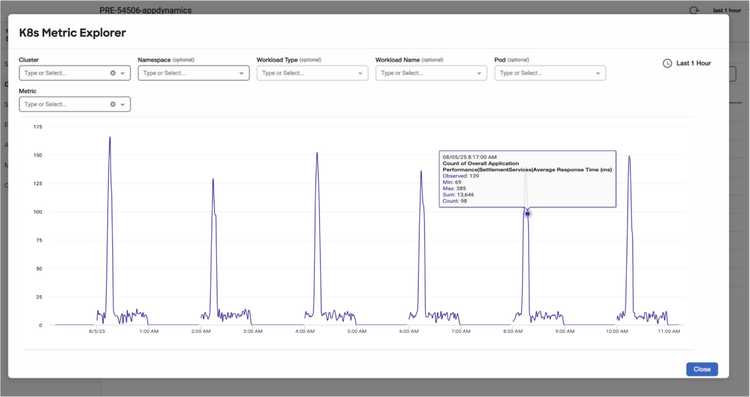 Previously, monitoring Kubernetes entities in AppDynamics required manual metric tracking and offered limited alerting, making issue detection slow and inefficient. AppDynamics now ingests metrics for key Kubernetes entities - clusters, namespaces, workloads, and pods - out of the box. Teams can define health rules directly on these entities and receive real-time alerts when violations occur, improving visibility into Kubernetes health. Event exploration and metric visualization accelerate troubleshooting, while upcoming dashboard and drill-down enhancements will enable deeper root cause analysis across entity hierarchies.